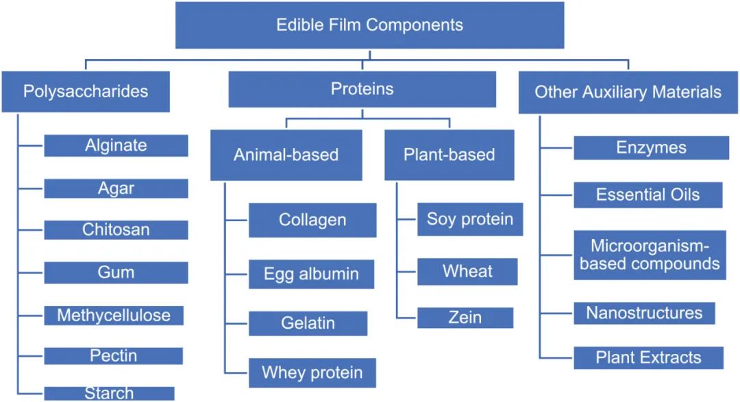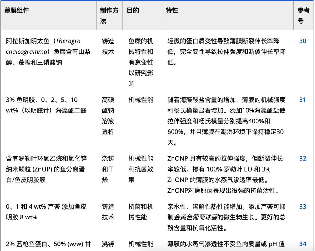 图1可食用薄膜组件的示意图。 蛋白质薄膜用于水产养殖产品的基于蛋白质的可食用膜可以由乳清、胶原蛋白、明胶、大豆、玉米或小麦制备。鱼明胶是动物蛋白的另一种来源。厄齐尔特等人。研究了使用酸和碱辅助工艺提取的鱼蛋白作为可生物降解涂层材料在冷藏和冷冻储存过程中对虹鳟鱼 ( Oncorhynchus mykiss ) 的影响。他们表示,未涂层鱼片的活菌和嗜冷细菌总数比涂层鱼片提高得更快。他们还报告说,基于蛋白质的涂层可以防止 pH 值、总挥发性碱氮 (TVB-N) 和游离脂肪酸值的恶化。然而,鱼水溶性蛋白质的可食用薄膜的水蒸气渗透性比许多其他蛋白质薄膜低。已经发表了几项关于鱼蛋白膜质量的研究。表1列出了一些生产方法 和水产食品薄膜材料。可食用薄膜可以直接由鱼肉或鱼糜洗涤水中的水溶性蛋白质生产。鱼糜用冷水清洗数次,去除肌浆蛋白,使鱼糜无味无臭。这种鱼糜洗水含有水溶性蛋白质,营养丰富,功能性强。使用冷冻阿拉斯加鳕鱼鱼糜制备成膜溶液,并将其加热至 和 100°C 以诱导蛋白质分子变性。鱼糜蛋白的溶解度、表面疏水性和活性巯基含量增加,在较高温度(70℃、100℃)下更有效地抑制肌球蛋白重链降解,并且随着膜溶解度和膜蛋白溶解度的降低,机械性能得到改善。这些结果表明,通过热处理防止肌球蛋白重链降解可以改善鱼糜膜的机械性能。
