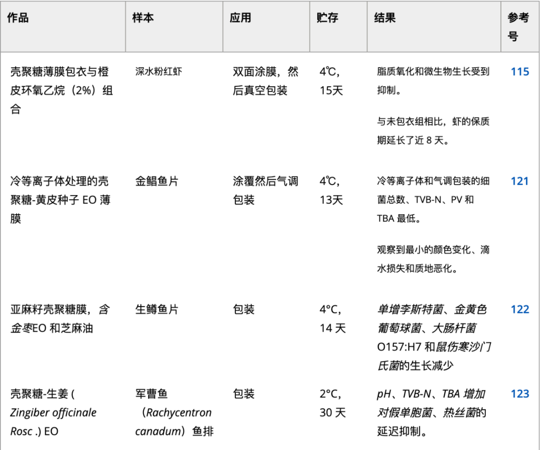 精油近年来,含有酚类和非酚类成分的环氧乙烷因其在水产食品中的抗菌和抗氧化特性而受到广泛关注。从植物中获得的环氧乙烷可用于保存水产食品。此外,在成膜过程中,油的加入可以降低表面粗糙度,因为它们占据微小的表面空隙。柠檬、马郁兰、香芹酚、肉桂、大蒜、黄芪、丁香、生姜、 月桂树、 姜黄、橙皮、迷迭香、百里香、牛至、和罗勒种均已成功用作薄膜材料。例如,富含百里香 ( Origanum minutiflorum ) 和迷迭香 ( Rosmarinus officinalis ) EO 的壳聚糖薄膜可改善烟熏虹鳟鱼在 4°C 下的质量特性和保质期。卢等人。研究了由壳聚糖、聚乙烯醇和百里香 EO 组成的复合膜对黑鱼(Channa argus)的质量和保质期影响。他们表示,经过可食用薄膜处理的样品保质期延长了4天。含EOs可食膜的特性及其对水产食品理化特性的影响见表 4。如此表所示,非热处理也适用于添加 EO 的薄膜。冷等离子体和高压处理可改善可食用包装薄膜的热机械、物理和结构性能。137这些处理还可以通过生物聚合物和活性化合物之间的交联过程,减缓可食用薄膜中活性化合物的释放。这样可以控制生物活性物质释放到水产食品中,从而减少微生物负荷。因此,应进一步研究冷等离子体、臭氧化和高静水压的预处理或后处理,以获得对掺有环氧乙烷的薄膜的协同效应。