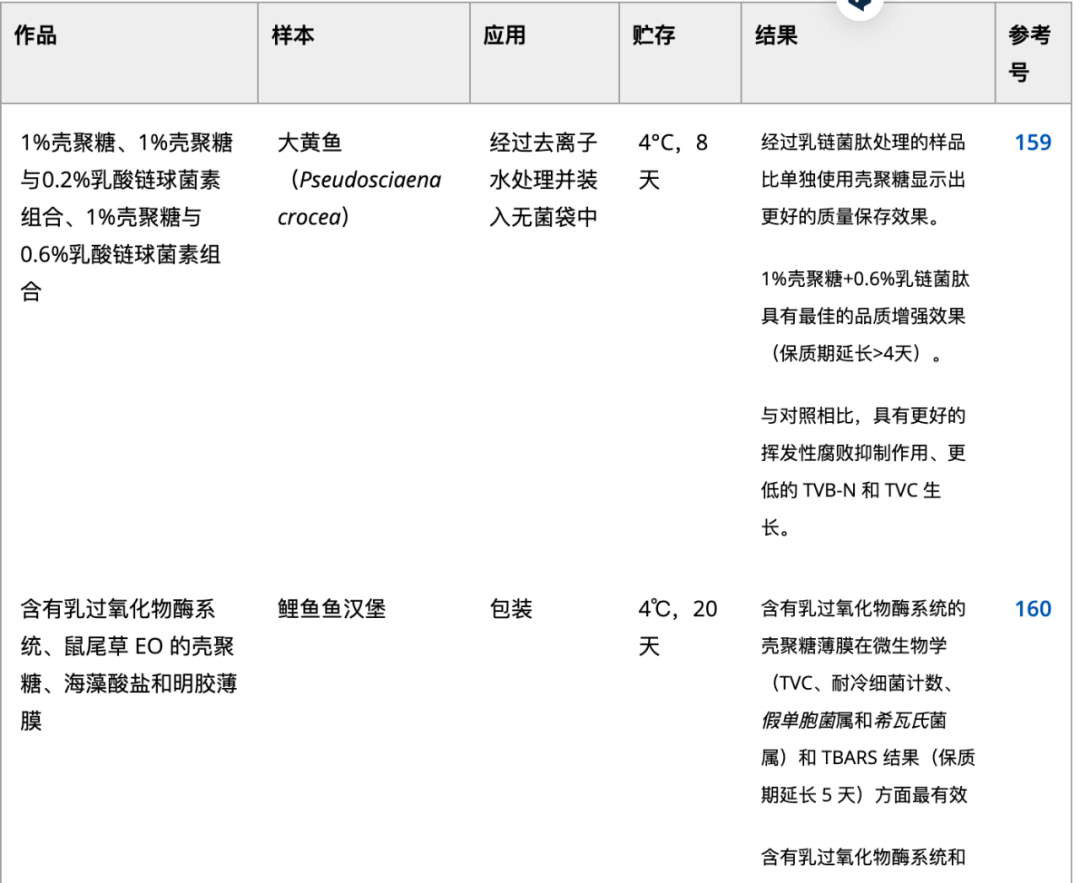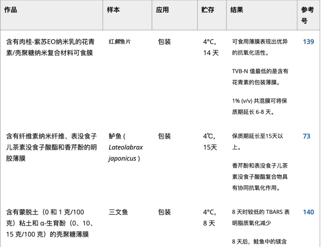 纳米乳液的尺寸范围大多为 100-600 nm,呈现乳白色外观。纳米乳液可以增加活性化合物跨生物膜的运输。149因此,含有纳米乳液的可食用薄膜可能表现出改进的特性。139 这些研究表明,使用具有高抗菌和阻隔功能的纳米纤维、纳米粒子、纳米乳液和纳米复合薄膜有可能提高水产养殖产品在储存过程中的稳定性。 微生物源和酶添加剂消费者对健康和营养的兴趣不断增加,导致对含有微生物化合物的生物聚合物的成膜特性的研究得到改进。6表6总结了水产养殖产品与微生物抗菌剂和酶结合使用的研究 。