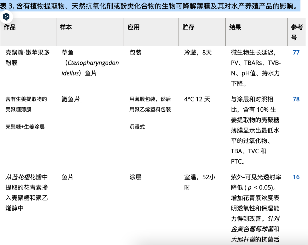 图2可食性薄膜在水产养殖产品上的应用方法 浸渍是涂覆食品最常用的方法之一。这是基于将待涂覆的产品浸入可食用薄膜溶液中并且产品吸收溶液的原理。浸泡过程由三个步骤组成。第一步,将产品浸入可食用薄膜溶液中。过滤并除去多余的表面液体。随后,通过加热和干燥将产品表面上的溶剂和多余液体蒸发。当去除多余的涂层溶液时,溶液将在室温下干燥或使用干燥器干燥。这种方法简单且便宜。表面均匀性好,适合水产食品的完整包衣。 喷涂是另一种用于涂覆表面的常用方法。通过产生液滴,液体的表面积增加并通过一系列喷嘴分布在食物上。鼓风和压力雾化是一些常用的喷涂技术。浇注是另一种常用的方法。这是基于将可食用薄膜溶液倒在大体平坦的产品表面上并且溶液在该表面上形成层的原理。将生物聚合物溶解在适当的溶剂中、将溶液转移到模具中以及形成可食用膜溶液是薄膜制备的三个主要步骤。空气干燥器,例如热风炉、盘式干燥器、微波炉和真空干燥器,有利于可食用薄膜溶液的干燥以及薄膜从模具中的取出。薄膜的快速干燥对其物理和结构性能产生负面影响。另一方面,刷涂法是用刷子涂抹可食性薄膜溶液,在产品表面不留任何间隙。包装薄膜材料也可以通过将聚合物均匀嵌入复合材料中来开发。瑞莎等人。利用吹膜挤出技术开发了一种掺有壳聚糖的抗菌聚乙烯薄膜,并将其应用于鱼产品。先前的文献也研究了其他应用,例如通过摩擦、包裹或涂覆薄膜溶液进行纳米涂层。 掺入其他材料以改善食用膜除成膜高分子聚合物外,增塑剂和溶剂是可食性薄膜的主要成分。增塑剂可降低分子间作用力并增加生物聚合物链的流动性,从而提高薄膜的机械性能。增塑剂对于为多糖膜提供光泽也是必要的,并且通常会增加溶解在膜中的气体、水蒸气和固体材料的通过。当将溶剂添加到蛋白质膜时,由于 pH 变化、添加提供交联的电解质或施加热量,多肽链会发生部分变性。膜中的蛋白质结构取决于多种因素,例如蛋白质溶液的pH、增塑剂、制备的膜的厚度、制备条件以及形成膜的溶液中包含的结构。本节介绍其他辅助材料,例如环氧乙烷、植物提取物、纳米结构和微生物化合物。 植物提取物或酚类化合物 植物提取物已被广泛用作薄膜增强剂,以提高抗菌和抗氧化活性。表3总结了最近关于水产养殖产品的植物提取物、天然抗氧化剂和添加苯酚的膜的出版物 。这些提取物显着延迟了储存期间的脂质氧化和微生物降解。例如,Raeisi 等人。块半油炸虹鳟鱼 ( O. mykiss ) 鱼片,配以青葱浆果 ( Allium ascalonicum ) 和玉米茴香 ( Trachyspermum ammi ) 种子提取物。同样,Bazargani-Gilani 开发了负载白藜芦醇的藻酸盐,可在冷藏期间保护虹鳟鱼片 15 天。这些薄膜比不含白藜芦醇的藻酸盐薄膜更能有效地抑制乳酸菌、酵母菌和霉菌的生长。其他化合物,如来自茶的蓝花楹花青素多酚和姜辣素87也被报道可以增强薄膜的抗菌性能。因此,植物源水果多糖可以作为可食性薄膜中果胶多糖的新来源。所有这些研究都证明,草药提取物、从植物中提取的花青素或多酚是替代天然防腐剂,当包含在可食用薄膜中时,可以改善机械、防潮、热和抗菌性能。