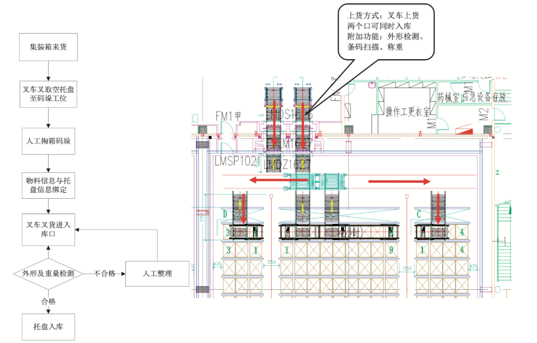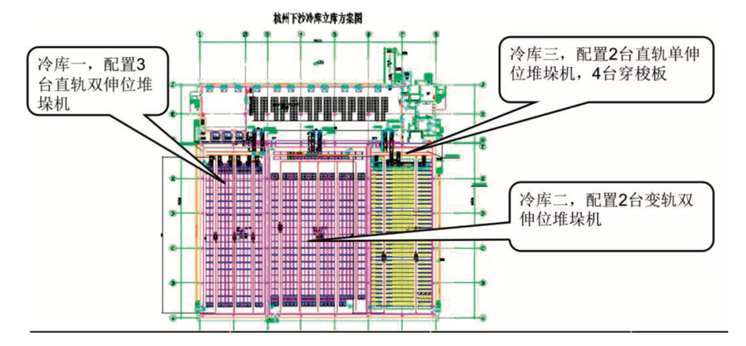 图1 冷库方案图 杭州下沙进口肉类指定查验场项目的冷库采用了堆垛机+穿梭车的自动化密集存储系统设计,使用直轨堆垛机、变轨堆垛机和托盘式穿梭车的设计方案,以及高度集成的WMS、WCS管理系统,10个巷道可同时进行自动进出货作业,实现了仓储管理的高度自动化,货物进出库复合作业效率达到每小时200托以上。