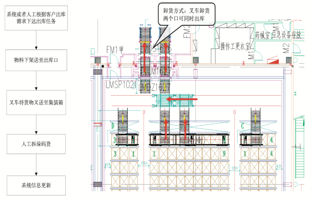 图2 入库流程图 出库:堆垛机将货物送到巷道口输送线上,或者穿梭车将指定货物运送至子巷道端口,堆垛机通过货叉取走货物,放置到库口输送线上,再由其他输送系统将货物转运到库外出库口的输送线上,由叉车或其他搬运设备取走发货。